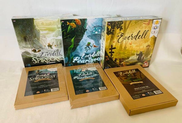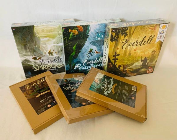 Voorbij de comfortabele grenzen van de vallei van Everdell, diep verstopt in mysterieuze en onontdekte landen, wacht een groot avontuur. Oude ruïnes? Boswezens uit vreemde landen? Reuzen? Pak je reisuitrusting bij elkaar en verzamel alle moed: maak je klaar voor een gewaagde reis door de bergen van Spirecrest! Tijdens je reis zul je op de proef gesteld worden door de verschillende weersomstandigheden van de verschillende seizoenen.