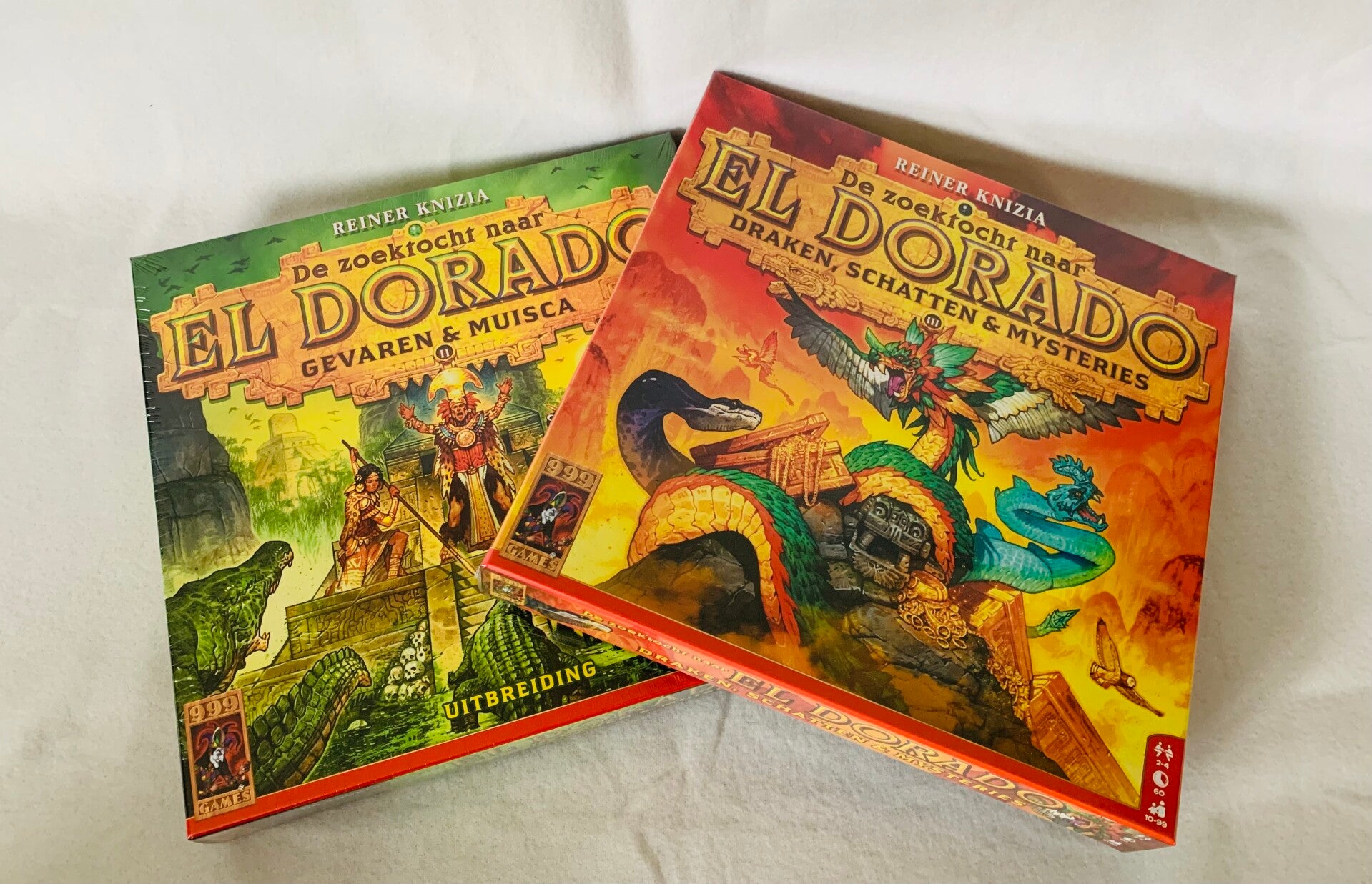 Nieuwe avonturen in de Zoektocht naar El Dorado! Deze uitbreiding introduceert de nieuwe modules “Gevaren” en “Muisca”. De Muisca is een mysterieuze stam, die jou wil helpen de stad van goud te vinden. “Gevaren” brengt nieuwe uitdagingen met zich mee, zoals krokodillen, stroomversnellingen en tempels met sleutels tot de Stad van Goud. Combineer met nieuwe grotfiches voor nog meer variatie!