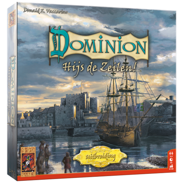 Dominion Hijs de Zeilen: Grote uitbreiding op Dominion. Met nieuwe kaartsoort, waarbij kaarten een beurt langer blijven liggen. Bevat 25 nieuwe koninkrijkkaarten, verschillende tableaus, embargofiches en munten.