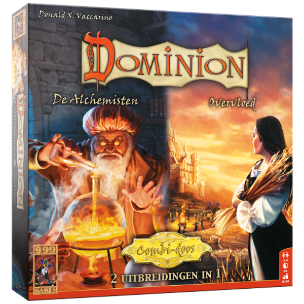 Dominion Alchemisten & Overvloed: 2 uitbreidingen op Dominion in 1 doos. Overvloed bevat 13 nieuwe koninkrijkkaarten en 5 speciale prijskaarten, die toegespitst zijn op het hebben van verschillende handkaarten. De Alchemisten bevat 12 nieuwe actiekaarten en een nieuw soort geldkaart, de Toverdrank. Voor nog meer variatie!